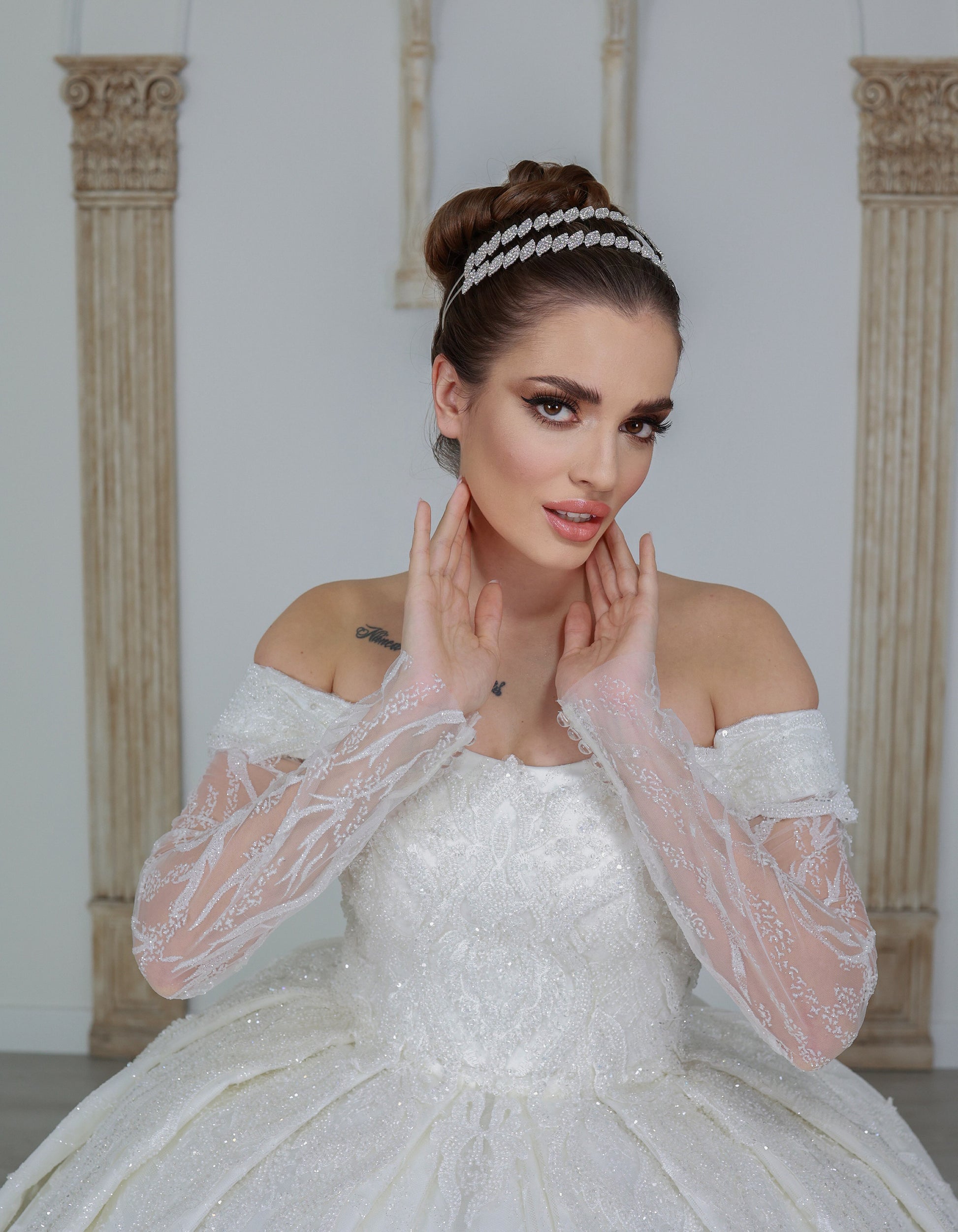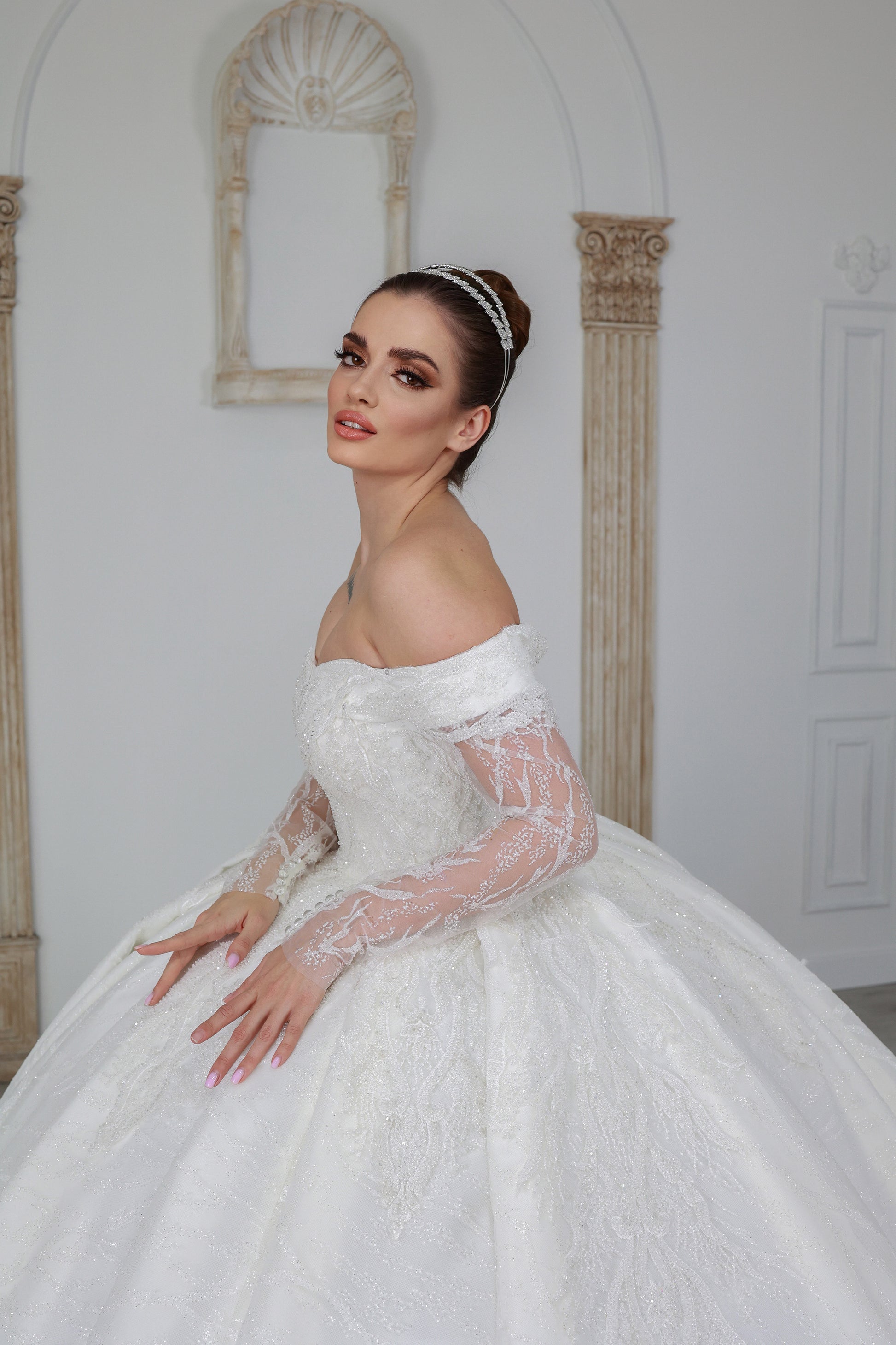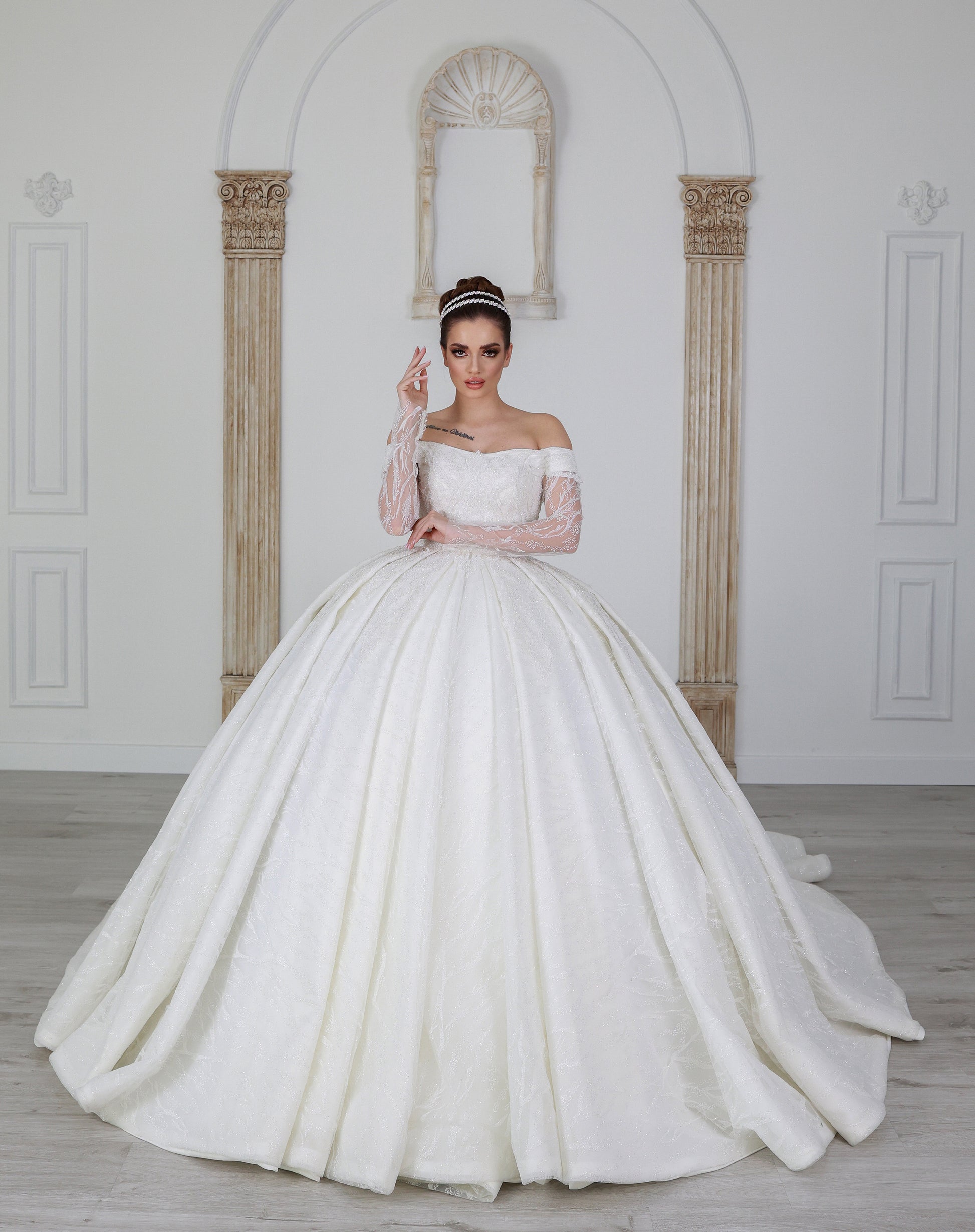 Azze ballgown wedding dress is the epitome of glamour and elegance. This dress features a puffy ballgown silhouette that will make any bride feel like a princess on her special day. The off-the-shoulder neckline is accented with delicate sleeves, while the lace beading with beads, sequins, and crystals adds a touch of sparkle and shine. The shiny patterned glittery fabric is perfect for the bride who wants to shine and stand out on her wedding day. This dress is the perfect choice for any bride who wants to look and feel like royalty.