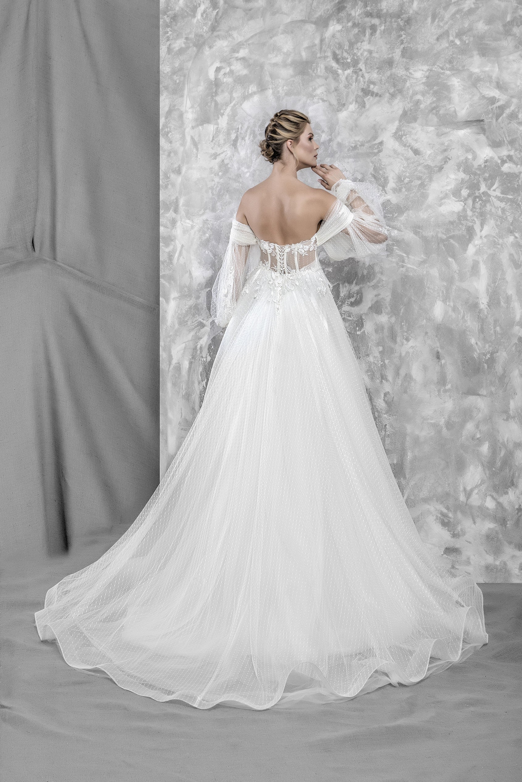 Ela narrow skirt A-line wedding dress is the ultimate choice for brides who want to look elegant and chic on their big day. Featuring balloon sleeves and an off-the-shoulder design, this dress perfectly combines vintage and modern elements. The see-through bustier with lace detailing add a touch of romance to the overall look. Made from high-quality tulle and lace fabric, this dress is comfortable to wear and move around in. With beautiful beading in the form of beads and pearls, the Ela narrow skirt A-line wedding dress is the perfect choice for any bride who wants to look and feel like a princess.