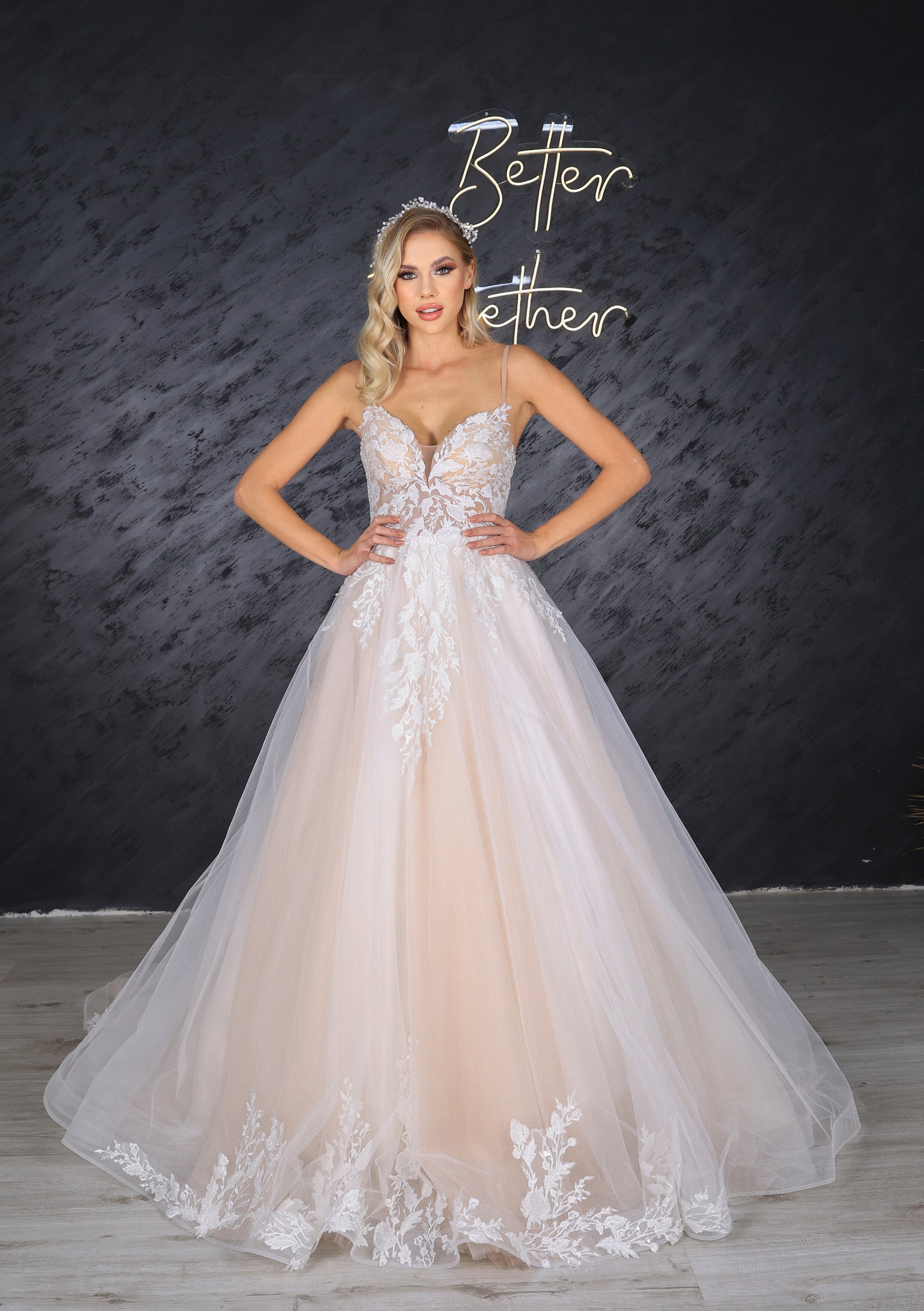 Lena narrow skirt A-line wedding dress is the perfect choice for the modern bride who wants to look elegant and sophisticated on her big day. This stunning dress features a glittery tulle fabric that adds a touch of glamour to your bridal look. The see-through bustier with spaghetti straps creates a contemporary look that is both stylish and sexy. The shiny lace with beads and sequins adds a touch of sparkle and the V-neckline is both flattering and feminine. This Lena wedding dress is the ultimate choice for the bride who wants to look beautiful and feel confident on her special day.
