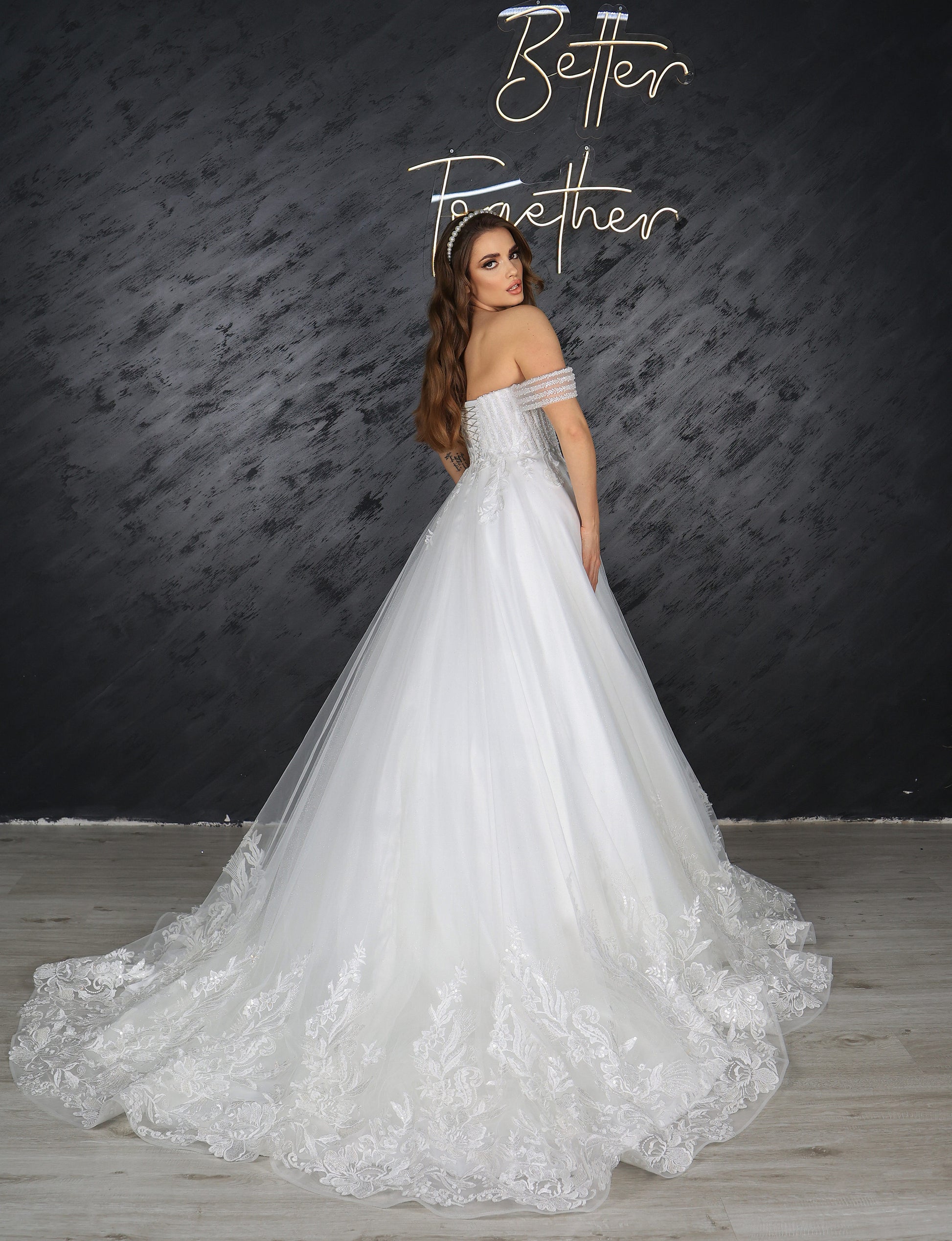 L'abito da sposa Nina A-line è perfetto per la sposa moderna che desidera apparire elegante e senza tempo nel suo giorno speciale. Questo splendido abito presenta un bustier con due diversi effetti di pizzo, che aggiungono un tocco di raffinatezza al design generale. Il tulle scintillante e lo stile a spalle scoperte rendono questo abito unico, mentre il delicato pizzo impreziosito da perline, perle e paillettes aggiunge un tocco di glamour. L'abito da sposa Nina A-line è dotato anche di un velo abbinato per completare il look.