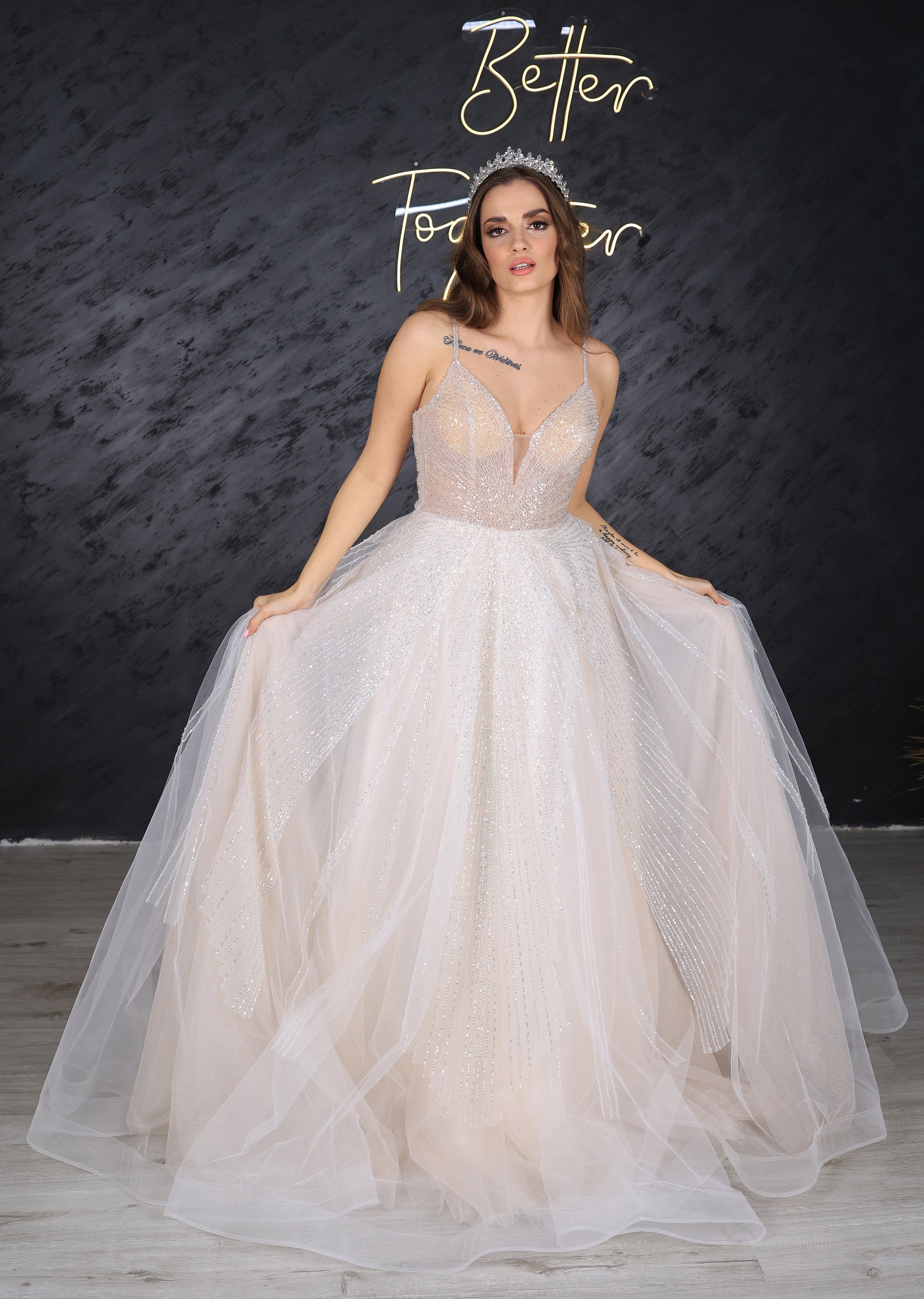 Abito da sposa Parla con gonna stretta e linea ad A, la scelta perfetta per ogni sposa che desidera brillare nel suo giorno speciale. Le perline e le paillettes scintillanti che adornano l'intero abito creano un effetto scintillante che non passerà inosservato. L'elegante bustier trasparente presenta uno scollo a V e spalline sottili, aggiungendo un tocco di raffinatezza al design generale. Il tulle scintillante della gonna aggiunge un tocco sognante all'abito, rendendolo la scelta perfetta per una cerimonia nuziale romantica. Fai un passo avanti con stile e lasciati notare con questo abito da sposa mozzafiato.